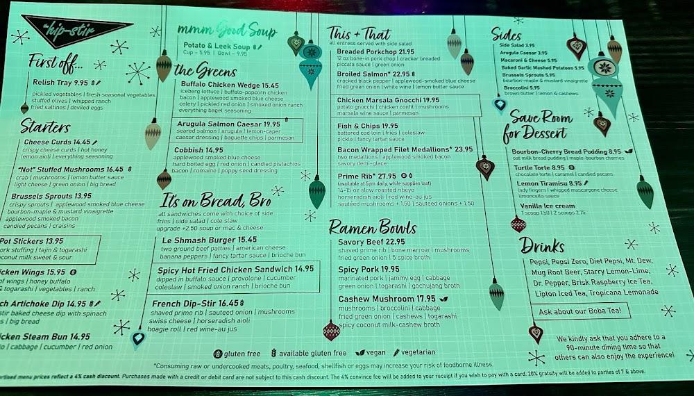 The Hip-Stir's menu offers an engaging blend of flavors and culinary styles. Signature items like Le Shmashburger, a buttery double smash burger, and Pork Belly Ramen showcase the creative approach to food. Each dish reflects quality and passion.