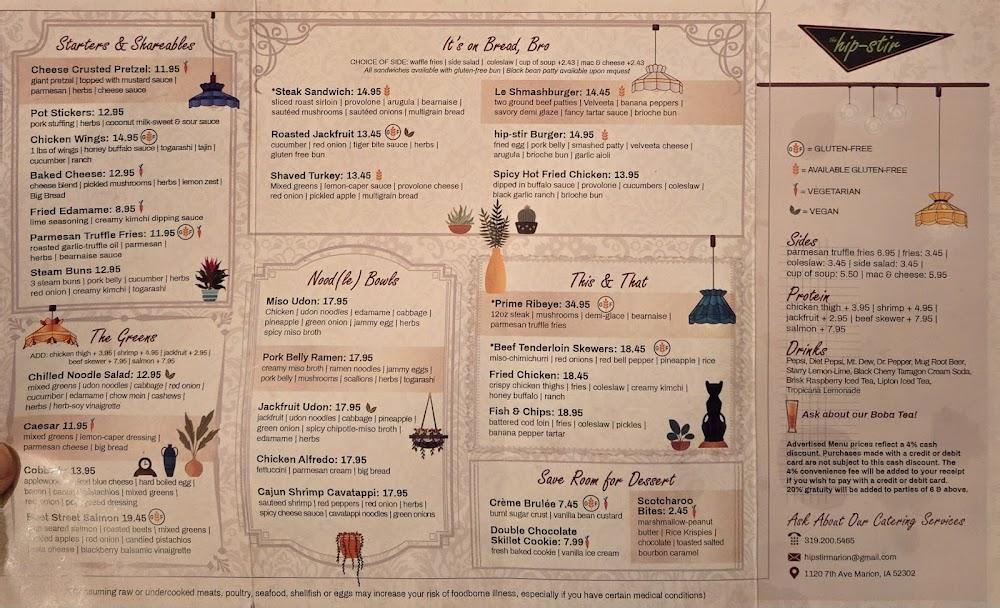 Welcome to The Hip-Stir, a vibrant New American restaurant and cocktail bar nestled in the heart of the Marion Uptown District. Experience our eclectic decor that combines a big city vibe with a warm, down-to-earth Iowa attitude. Enjoy an extensive menu featuring local specialties, delicious vegetarian options, and mouth-watering desserts, all paired with excellent cocktails and a wide selection of beers. Whether you're dining solo, enjoying brunch, or seeking a lively dinner, The Hip-Stir offers a welcoming atmosphere for all. Join us on our accessible patio or take advantage of our takeout and delivery services—your perfect dining experience awaits!